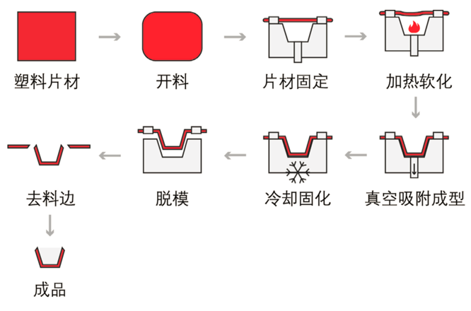 一種塑料加工工藝,主要原理是將平展的塑料硬片材加熱變軟后,采用真空吸附于模具表面,冷卻后成型,并應(yīng)用于各行各業(yè)的一種技術(shù)工藝。