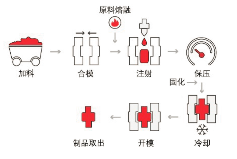 3.在柱塞或螺桿的加壓下物料被壓縮并向前移動(dòng),通過機(jī)筒前的射嘴以很快的速度注入較低溫度的閉合模腔內(nèi);