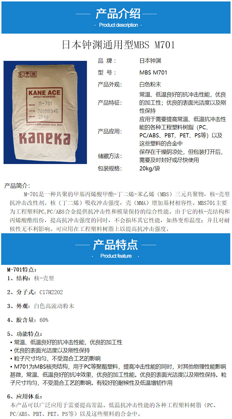 - 日本鐘淵MBS M701增韌劑 PC/ABS合金抗沖擊劑 增韌改性鐘淵mbs701 物性表, 日本鐘淵MBS M701增韌劑 PC/ABS合金抗沖擊劑 增韌改性鐘淵mbs701 產(chǎn)品參數(shù),日本鐘淵MBS M701增韌劑 PC/ABS合金抗沖擊劑 增韌改性鐘淵mbs701 性能表,日本鐘淵MBS M701增韌劑 PC/ABS合金抗沖擊劑 增韌改性鐘淵mbs701 出廠報(bào)告, MSDS,, 物質(zhì)安全資料表, UL黃卡,{ SGS報(bào)告, RoHS, 食品級(jí)認(rèn)證, NSF飲用水標(biāo)準(zhǔn), 產(chǎn)品資料, 產(chǎn)品性能, 出廠報(bào)告, 原廠原包, 代理商, 熱變形溫度, 熔指數(shù), 流動(dòng)系數(shù), 抗沖擊性能、沖擊強(qiáng)度, 低溫韌性、低溫抗沖擊性能, 熔體流動(dòng)系數(shù)、熔體流動(dòng)速率, 加工工藝、加工參數(shù)、加工溫度, 歐盟RoHS 德國(guó)FDA 美國(guó)FDA 日本FDA