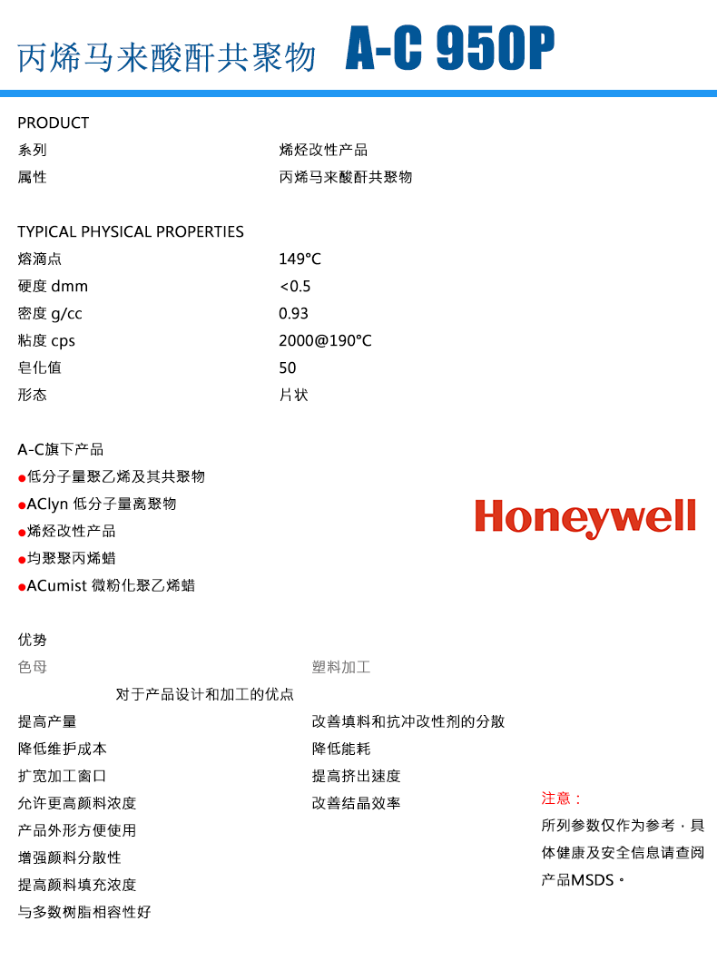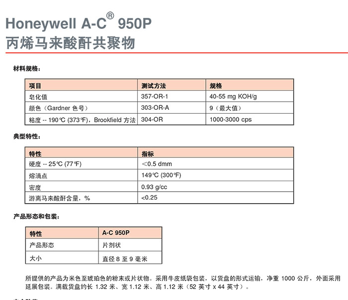 - 霍尼韋爾 honeywell 丙烯馬來酸酐共聚物 A-C 950P 適用熱熔膠電纜塑料改性 物性表, 霍尼韋爾 honeywell 丙烯馬來酸酐共聚物 A-C 950P 適用熱熔膠電纜塑料改性 產(chǎn)品參數(shù),霍尼韋爾 honeywell 丙烯馬來酸酐共聚物 A-C 950P 適用熱熔膠電纜塑料改性 性能表,霍尼韋爾 honeywell 丙烯馬來酸酐共聚物 A-C 950P 適用熱熔膠電纜塑料改性 出廠報(bào)告, MSDS,, 物質(zhì)安全資料表, UL黃卡,{ SGS報(bào)告, RoHS, 食品級(jí)認(rèn)證, NSF飲用水標(biāo)準(zhǔn), 產(chǎn)品資料, 產(chǎn)品性能, 出廠報(bào)告, 原廠原包, 代理商, 熱變形溫度, 熔指數(shù), 流動(dòng)系數(shù), 抗沖擊性能、沖擊強(qiáng)度, 低溫韌性、低溫抗沖擊性能, 熔體流動(dòng)系數(shù)、熔體流動(dòng)速率, 加工工藝、加工參數(shù)、加工溫度, 歐盟RoHS 德國(guó)FDA 美國(guó)FDA 日本FDA