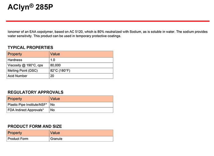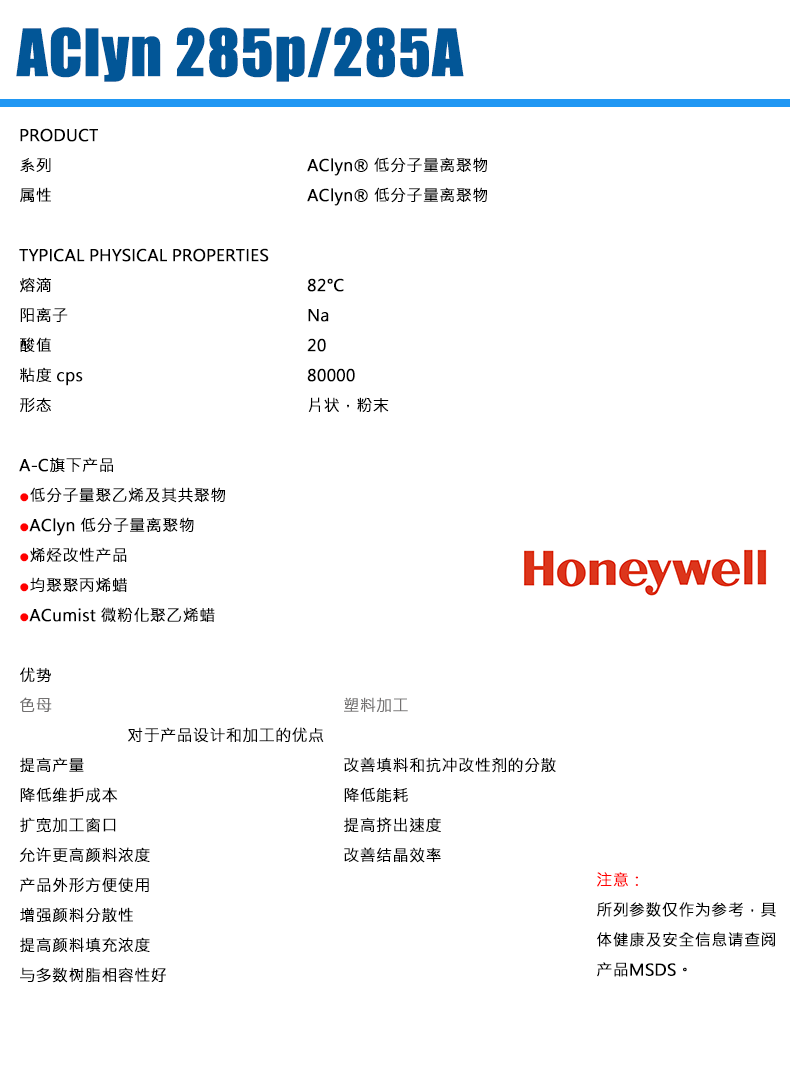 - 霍尼韋爾EAA離聚物蠟粉AClyn® 285P 結(jié)晶成核劑 物性表, 霍尼韋爾EAA離聚物蠟粉AClyn® 285P 結(jié)晶成核劑 產(chǎn)品參數(shù),霍尼韋爾EAA離聚物蠟粉AClyn® 285P 結(jié)晶成核劑 性能表,霍尼韋爾EAA離聚物蠟粉AClyn® 285P 結(jié)晶成核劑 出廠報(bào)告, MSDS,, 物質(zhì)安全資料表, UL黃卡,{ SGS報(bào)告, RoHS, 食品級認(rèn)證, NSF飲用水標(biāo)準(zhǔn), 產(chǎn)品資料, 產(chǎn)品性能, 出廠報(bào)告, 原廠原包, 代理商, 熱變形溫度, 熔指數(shù), 流動系數(shù), 抗沖擊性能、沖擊強(qiáng)度, 低溫韌性、低溫抗沖擊性能, 熔體流動系數(shù)、熔體流動速率, 加工工藝、加工參數(shù)、加工溫度, 歐盟RoHS 德國FDA 美國FDA 日本FDA