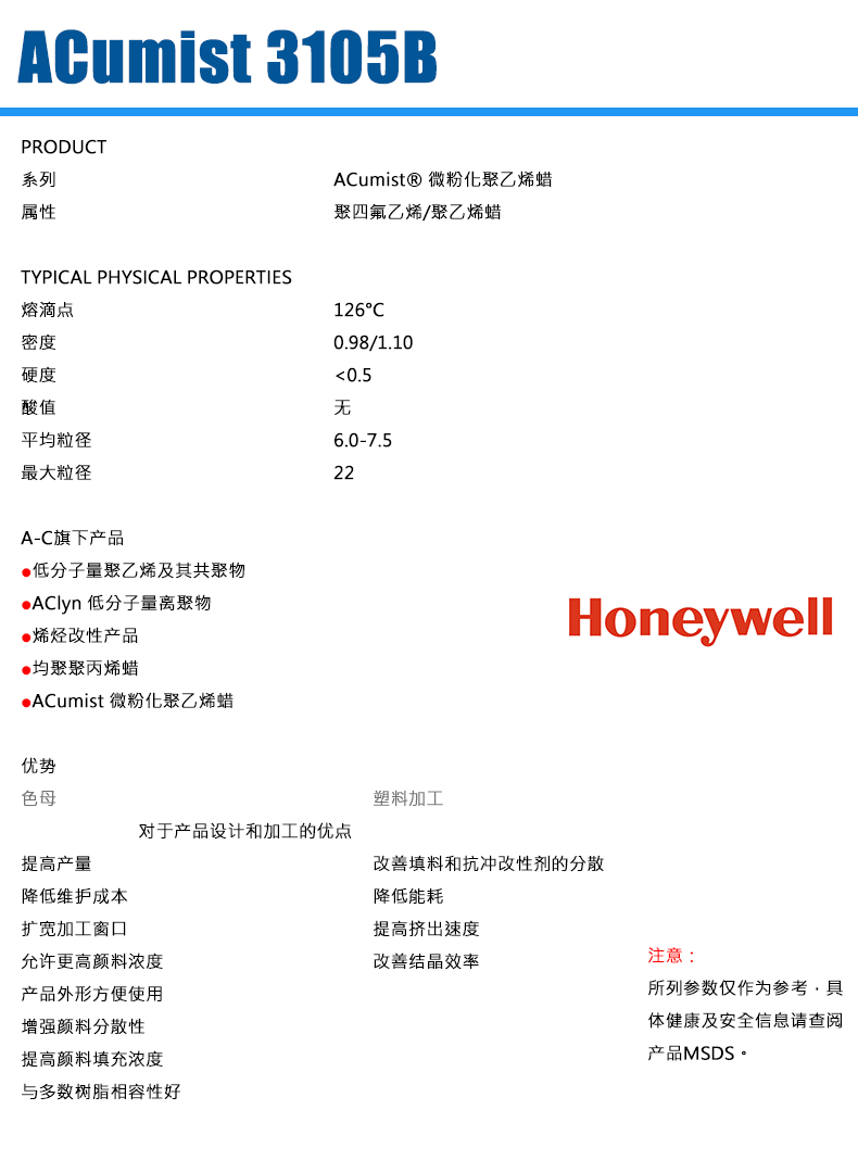 - 美國(guó)霍尼韋爾ACumist 3105B 聚四氟乙烯聚乙烯混合蠟粉 物性表, 美國(guó)霍尼韋爾ACumist 3105B 聚四氟乙烯聚乙烯混合蠟粉 產(chǎn)品參數(shù),美國(guó)霍尼韋爾ACumist 3105B 聚四氟乙烯聚乙烯混合蠟粉 性能表,美國(guó)霍尼韋爾ACumist 3105B 聚四氟乙烯聚乙烯混合蠟粉 出廠報(bào)告, MSDS,, 物質(zhì)安全資料表, UL黃卡,{ SGS報(bào)告, RoHS, 食品級(jí)認(rèn)證, NSF飲用水標(biāo)準(zhǔn), 產(chǎn)品資料, 產(chǎn)品性能, 出廠報(bào)告, 原廠原包, 代理商, 熱變形溫度, 熔指數(shù), 流動(dòng)系數(shù), 抗沖擊性能、沖擊強(qiáng)度, 低溫韌性、低溫抗沖擊性能, 熔體流動(dòng)系數(shù)、熔體流動(dòng)速率, 加工工藝、加工參數(shù)、加工溫度, 歐盟RoHS 德國(guó)FDA 美國(guó)FDA 日本FDA