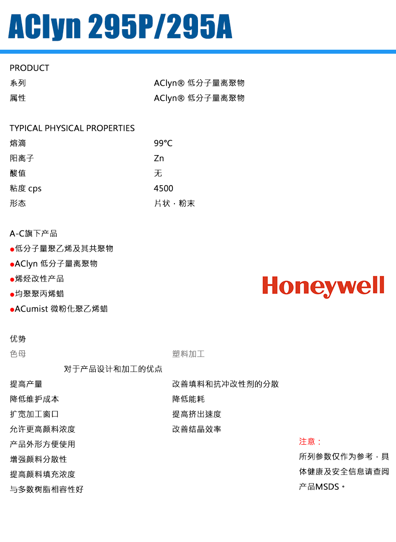 - Honeywell(霍尼韋爾) Acyln 295A低分子量離聚物 PBT尼龍成核劑 物性表, Honeywell(霍尼韋爾) Acyln 295A低分子量離聚物 PBT尼龍成核劑 產品參數,Honeywell(霍尼韋爾) Acyln 295A低分子量離聚物 PBT尼龍成核劑 性能表,Honeywell(霍尼韋爾) Acyln 295A低分子量離聚物 PBT尼龍成核劑 出廠報告, MSDS,, 物質安全資料表, UL黃卡,{ SGS報告, RoHS, 食品級認證, NSF飲用水標準, 產品資料, 產品性能, 出廠報告, 原廠原包, 代理商, 熱變形溫度, 熔指數, 流動系數, 抗沖擊性能、沖擊強度, 低溫韌性、低溫抗沖擊性能, 熔體流動系數、熔體流動速率, 加工工藝、加工參數、加工溫度, 歐盟RoHS 德國FDA 美國FDA 日本FDA