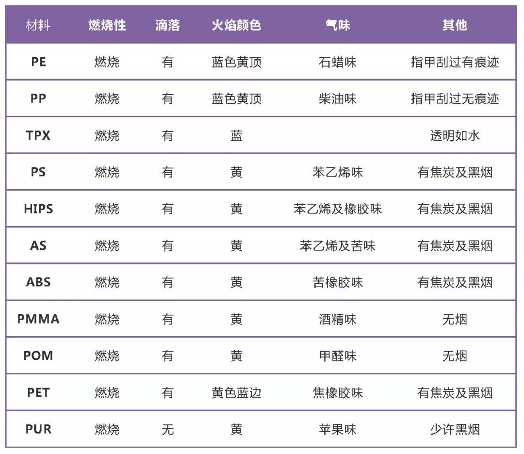 對于普通的塑料品種利用燃燒方法即可比較準確鑒別。燃燒時的火焰顏色、氣味以及離火后的狀態(tài)等可以作為鑒別的根據(jù)。