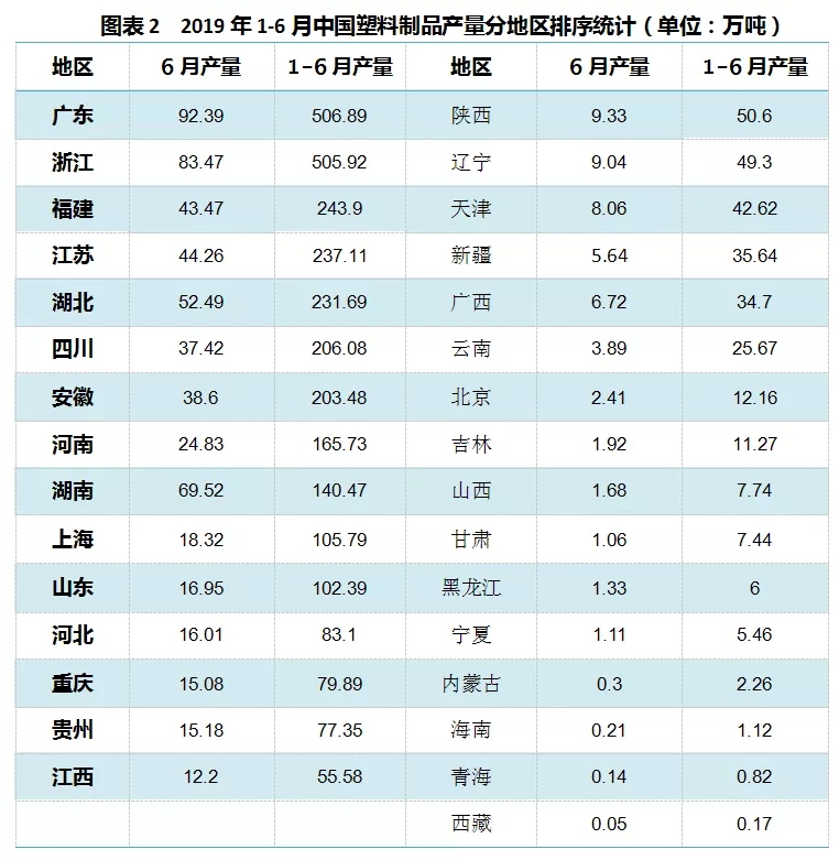 ????????1-6月塑料制品累計產(chǎn)量排名前五位(廣東、浙江、福建、江蘇和湖北)的總產(chǎn)量達到1725.51萬噸,占到全國總產(chǎn)量53.3%。(按6月規(guī)模企業(yè)統(tǒng)計)