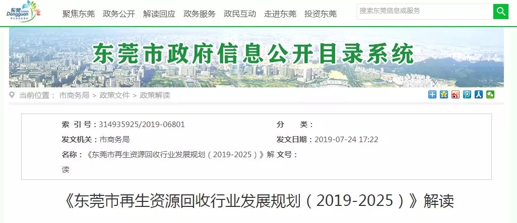 ????????7月24日,東莞市商務局對《東莞市再生資源回收行業(yè)發(fā)展規(guī)劃(2019-2025)》進行解讀,進一步規(guī)范再生資源回收行業(yè)發(fā)展