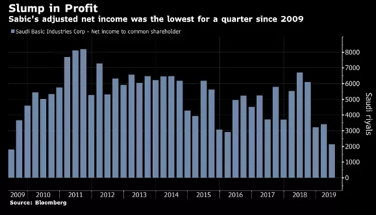 ????????由于對(duì)化學(xué)品和塑料的需求下降,沙特基礎(chǔ)工業(yè)公司(Saudi Basic Industries Corp.)第二季度利潤(rùn)跌至2009年以來(lái)的最低水平,其股價(jià)下跌3.8%。