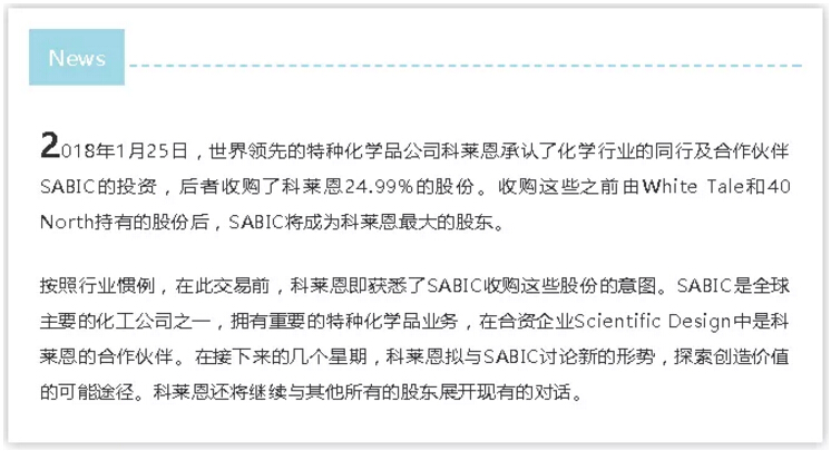 2018年1月SABIC收購(gòu)科萊恩25%股份