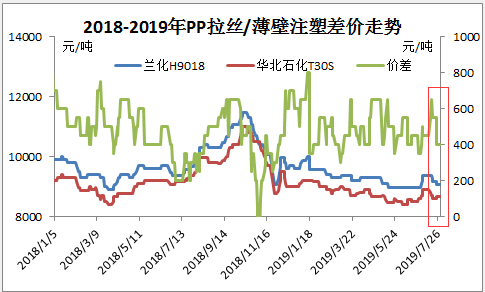 ????????從上圖可以看出,7月份,PP拉絲料/薄壁注塑料價差開始出現(xiàn)縮小趨勢。6月底7月初,薄壁注塑料和拉絲料價差在600元/噸左右,7月底,價差縮小至400元/噸,在利潤方面一直占有優(yōu)勢的薄壁注塑料,開始逐漸走下神壇。