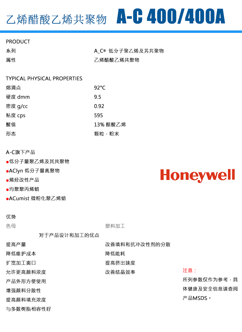 - 霍尼韋爾 honeywell EVA蠟 乙烯-醋酸乙烯共聚物蠟 AC-400A 顏料分散劑 物性表, 霍尼韋爾 honeywell EVA蠟 乙烯-醋酸乙烯共聚物蠟 AC-400A 顏料分散劑 產(chǎn)品參數(shù),霍尼韋爾 honeywell EVA蠟 乙烯-醋酸乙烯共聚物蠟 AC-400A 顏料分散劑 性能表,霍尼韋爾 honeywell EVA蠟 乙烯-醋酸乙烯共聚物蠟 AC-400A 顏料分散劑 出廠報告, MSDS,, 物質(zhì)安全資料表, UL黃卡,{ SGS報告, RoHS, 食品級認(rèn)證, NSF飲用水標(biāo)準(zhǔn), 產(chǎn)品資料, 產(chǎn)品性能, 出廠報告, 原廠原包, 代理商, 熱變形溫度, 熔指數(shù), 流動系數(shù), 抗沖擊性能、沖擊強(qiáng)度, 低溫韌性、低溫抗沖擊性能, 熔體流動系數(shù)、熔體流動速率, 加工工藝、加工參數(shù)、加工溫度, 歐盟RoHS 德國FDA 美國FDA 日本FDA