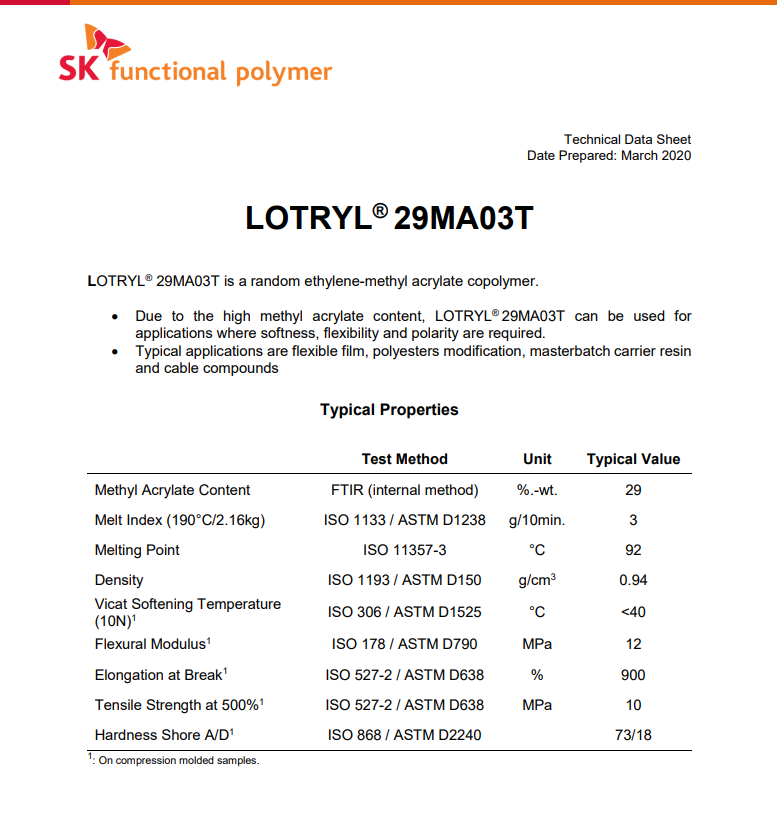 - 法國 Ema阿科瑪 Lotryl 29MA03T 電線電纜 乙烯-丙烯酸酯共聚物 物性表, 法國 Ema阿科瑪 Lotryl 29MA03T 電線電纜 乙烯-丙烯酸酯共聚物 產(chǎn)品參數(shù),法國 Ema阿科瑪 Lotryl 29MA03T 電線電纜 乙烯-丙烯酸酯共聚物 性能表,法國 Ema阿科瑪 Lotryl 29MA03T 電線電纜 乙烯-丙烯酸酯共聚物 出廠報告, MSDS,, 物質(zhì)安全資料表, UL黃卡,{ SGS報告, RoHS, 食品級認(rèn)證, NSF飲用水標(biāo)準(zhǔn), 產(chǎn)品資料, 產(chǎn)品性能, 出廠報告, 原廠原包, 代理商, 熱變形溫度, 熔指數(shù), 流動系數(shù), 抗沖擊性能、沖擊強度, 低溫韌性、低溫抗沖擊性能, 熔體流動系數(shù)、熔體流動速率, 加工工藝、加工參數(shù)、加工溫度, 歐盟RoHS 德國FDA 美國FDA 日本FDA