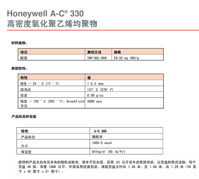 - Honeywell霍尼韋爾 A-C 330 蠟粉 高密度氧化聚乙烯蠟 物性表, Honeywell霍尼韋爾 A-C 330 蠟粉 高密度氧化聚乙烯蠟 產(chǎn)品參數(shù),Honeywell霍尼韋爾 A-C 330 蠟粉 高密度氧化聚乙烯蠟 性能表,Honeywell霍尼韋爾 A-C 330 蠟粉 高密度氧化聚乙烯蠟 出廠報(bào)告, MSDS,, 物質(zhì)安全資料表, UL黃卡,{ SGS報(bào)告, RoHS, 食品級(jí)認(rèn)證, NSF飲用水標(biāo)準(zhǔn), 產(chǎn)品資料, 產(chǎn)品性能, 出廠報(bào)告, 原廠原包, 代理商, 熱變形溫度, 熔指數(shù), 流動(dòng)系數(shù), 抗沖擊性能、沖擊強(qiáng)度, 低溫韌性、低溫抗沖擊性能, 熔體流動(dòng)系數(shù)、熔體流動(dòng)速率, 加工工藝、加工參數(shù)、加工溫度, 歐盟RoHS 德國(guó)FDA 美國(guó)FDA 日本FDA