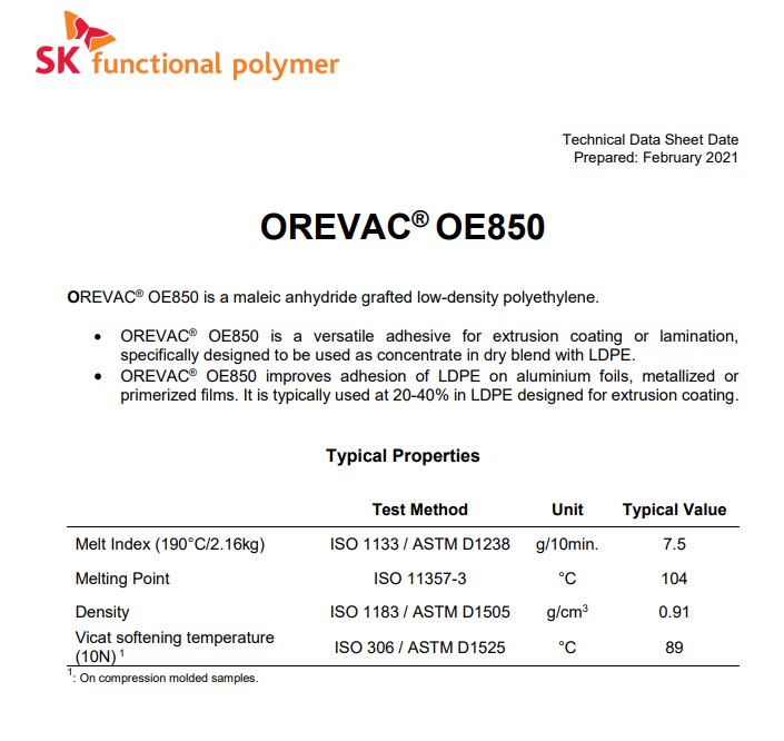 - 阿科瑪Orevac® OE850粘結樹脂粘結樹脂 物性表, 阿科瑪Orevac® OE850粘結樹脂粘結樹脂 產(chǎn)品參數(shù),阿科瑪Orevac® OE850粘結樹脂粘結樹脂 性能表,阿科瑪Orevac® OE850粘結樹脂粘結樹脂 出廠報告, MSDS,, 物質安全資料表, UL黃卡,{ SGS報告, RoHS, 食品級認證, NSF飲用水標準, 產(chǎn)品資料, 產(chǎn)品性能, 出廠報告, 原廠原包, 代理商, 熱變形溫度, 熔指數(shù), 流動系數(shù), 抗沖擊性能、沖擊強度, 低溫韌性、低溫抗沖擊性能, 熔體流動系數(shù)、熔體流動速率, 加工工藝、加工參數(shù)、加工溫度, 歐盟RoHS 德國FDA 美國FDA 日本FDA