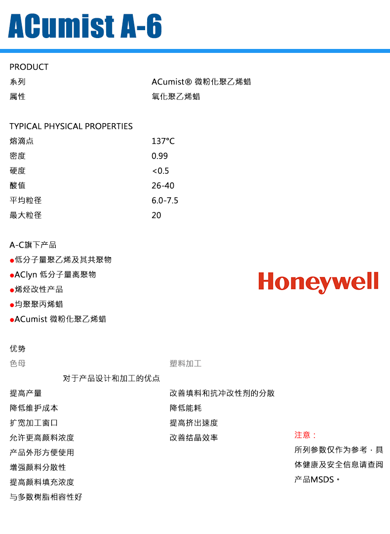 - 霍尼韋爾蠟粉 ACumist A-6 微粉化氧化聚乙烯蠟 物性表, 霍尼韋爾蠟粉 ACumist A-6 微粉化氧化聚乙烯蠟 產(chǎn)品參數(shù),霍尼韋爾蠟粉 ACumist A-6 微粉化氧化聚乙烯蠟 性能表,霍尼韋爾蠟粉 ACumist A-6 微粉化氧化聚乙烯蠟 出廠報告, MSDS,, 物質(zhì)安全資料表, UL黃卡,{ SGS報告, RoHS, 食品級認(rèn)證, NSF飲用水標(biāo)準(zhǔn), 產(chǎn)品資料, 產(chǎn)品性能, 出廠報告, 原廠原包, 代理商, 熱變形溫度, 熔指數(shù), 流動系數(shù), 抗沖擊性能、沖擊強度, 低溫韌性、低溫抗沖擊性能, 熔體流動系數(shù)、熔體流動速率, 加工工藝、加工參數(shù)、加工溫度, 歐盟RoHS 德國FDA 美國FDA 日本FDA
