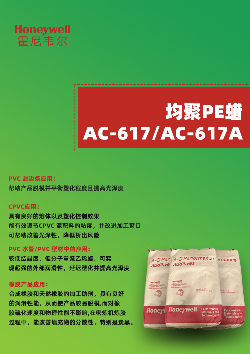 - 霍尼韋爾 橡膠助劑 AC-617 橡膠分散劑低分子聚乙烯蠟 物性表, 霍尼韋爾 橡膠助劑 AC-617 橡膠分散劑低分子聚乙烯蠟 產(chǎn)品參數(shù),霍尼韋爾 橡膠助劑 AC-617 橡膠分散劑低分子聚乙烯蠟 性能表,霍尼韋爾 橡膠助劑 AC-617 橡膠分散劑低分子聚乙烯蠟 出廠報(bào)告, MSDS,, 物質(zhì)安全資料表, UL黃卡,{ SGS報(bào)告, RoHS, 食品級認(rèn)證, NSF飲用水標(biāo)準(zhǔn), 產(chǎn)品資料, 產(chǎn)品性能, 出廠報(bào)告, 原廠原包, 代理商, 熱變形溫度, 熔指數(shù), 流動(dòng)系數(shù), 抗沖擊性能、沖擊強(qiáng)度, 低溫韌性、低溫抗沖擊性能, 熔體流動(dòng)系數(shù)、熔體流動(dòng)速率, 加工工藝、加工參數(shù)、加工溫度, 歐盟RoHS 德國FDA 美國FDA 日本FDA