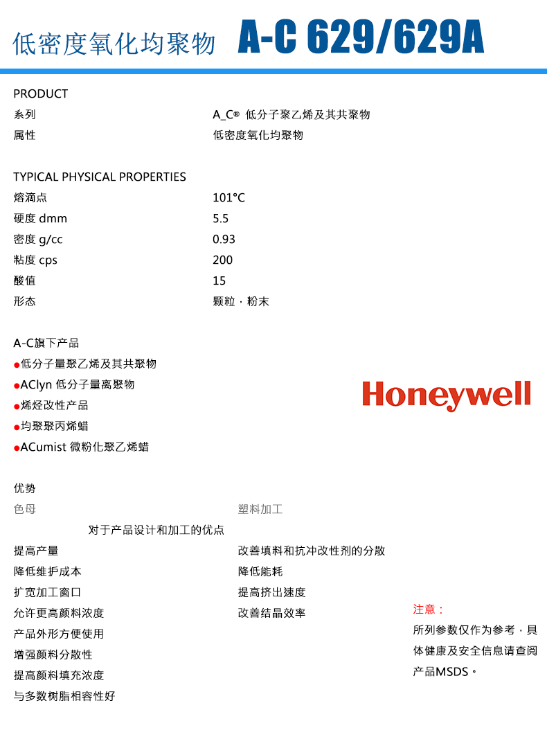 - 美國霍尼韋爾 honeywell 氧化聚乙烯蠟 AC 629 物性表, 美國霍尼韋爾 honeywell 氧化聚乙烯蠟 AC 629 產品參數,美國霍尼韋爾 honeywell 氧化聚乙烯蠟 AC 629 性能表,美國霍尼韋爾 honeywell 氧化聚乙烯蠟 AC 629 出廠報告, MSDS,, 物質安全資料表, UL黃卡,{ SGS報告, RoHS, 食品級認證, NSF飲用水標準, 產品資料, 產品性能, 出廠報告, 原廠原包, 代理商, 熱變形溫度, 熔指數, 流動系數, 抗沖擊性能、沖擊強度, 低溫韌性、低溫抗沖擊性能, 熔體流動系數、熔體流動速率, 加工工藝、加工參數、加工溫度, 歐盟RoHS 德國FDA 美國FDA 日本FDA
