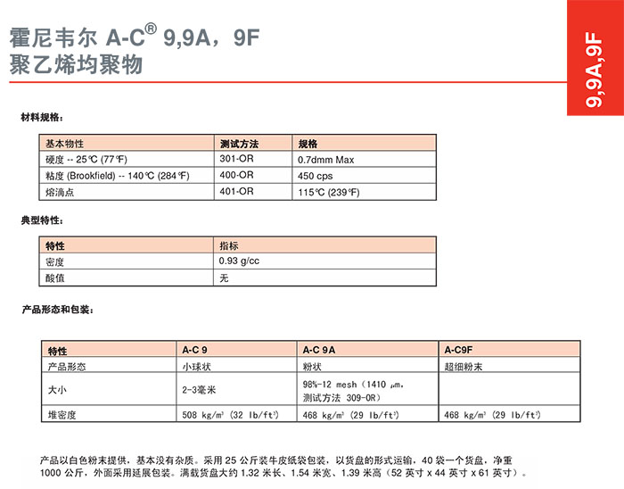 - 霍尼韋爾 A-C® 9A 低密度聚乙烯 (LDPE) 均聚物 物性表, 霍尼韋爾 A-C® 9A 低密度聚乙烯 (LDPE) 均聚物 產(chǎn)品參數(shù),霍尼韋爾 A-C® 9A 低密度聚乙烯 (LDPE) 均聚物 性能表,霍尼韋爾 A-C® 9A 低密度聚乙烯 (LDPE) 均聚物 出廠報告, MSDS,, 物質(zhì)安全資料表, UL黃卡,{ SGS報告, RoHS, 食品級認證, NSF飲用水標(biāo)準(zhǔn), 產(chǎn)品資料, 產(chǎn)品性能, 出廠報告, 原廠原包, 代理商, 熱變形溫度, 熔指數(shù), 流動系數(shù), 抗沖擊性能、沖擊強度, 低溫韌性、低溫抗沖擊性能, 熔體流動系數(shù)、熔體流動速率, 加工工藝、加工參數(shù)、加工溫度, 歐盟RoHS 德國FDA 美國FDA 日本FDA