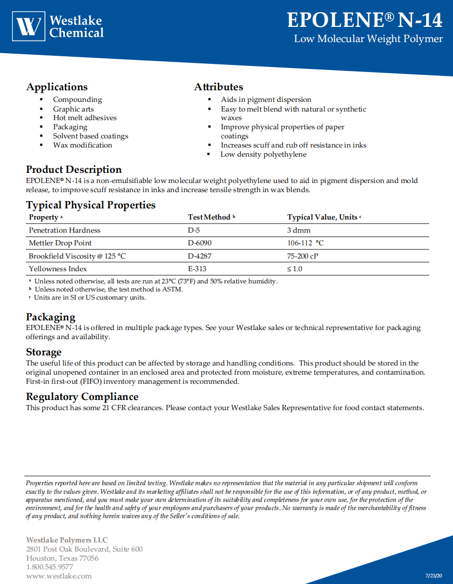 美國WESTLAKE 聚乙烯蠟 N-14